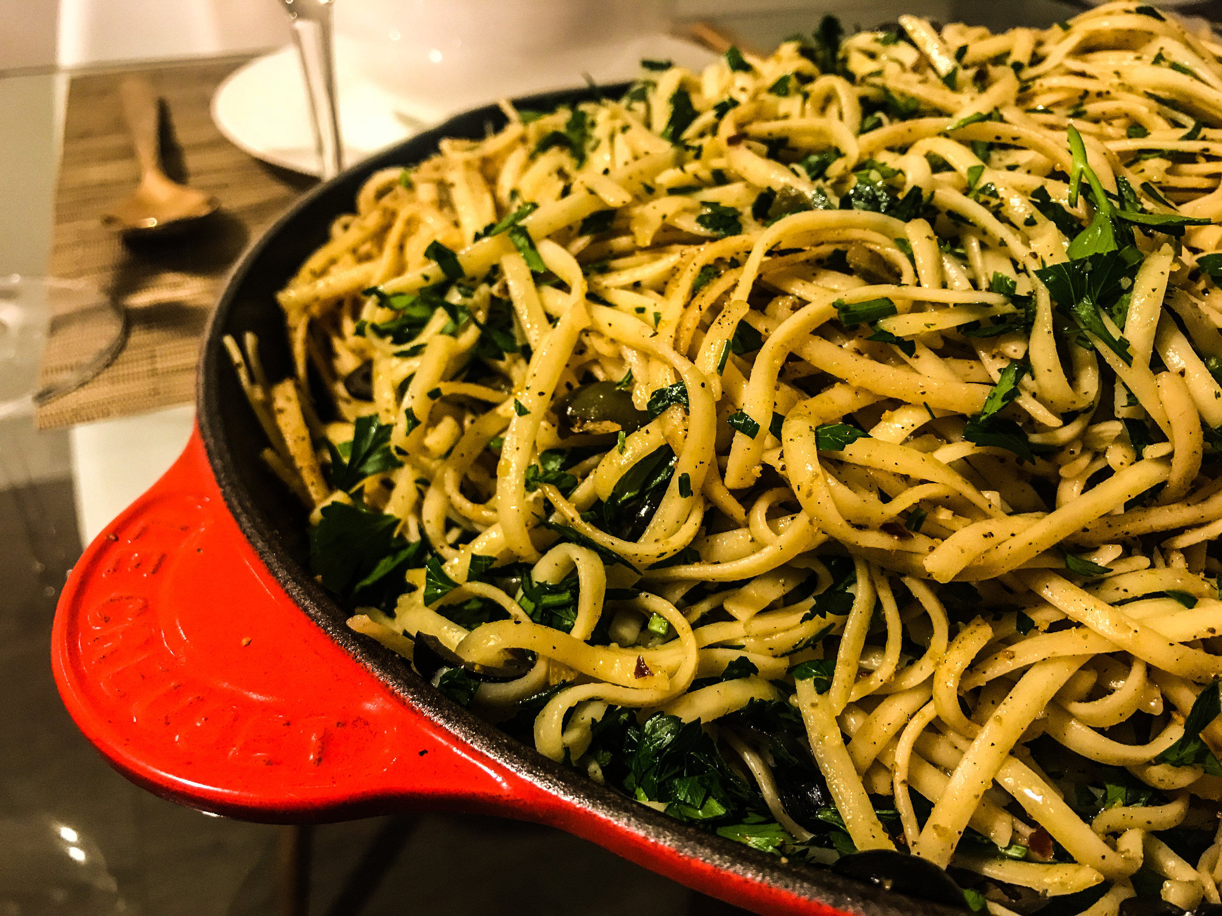 I’ve always loved cooking for company. Whether it’s one person or a party of twelve, I absolutely love it. Whenever I have a dinner party, there’s always got to be a theme. I’ve recently just booked my flight to Rome (less than a week away!!!) so I thought I’d make something with a bit of an Italian inspiration. Thanks to some leftovers I had in the fridge and in my pantry, I decided to make a deliciously briny linguine with olives and bread crumbs.